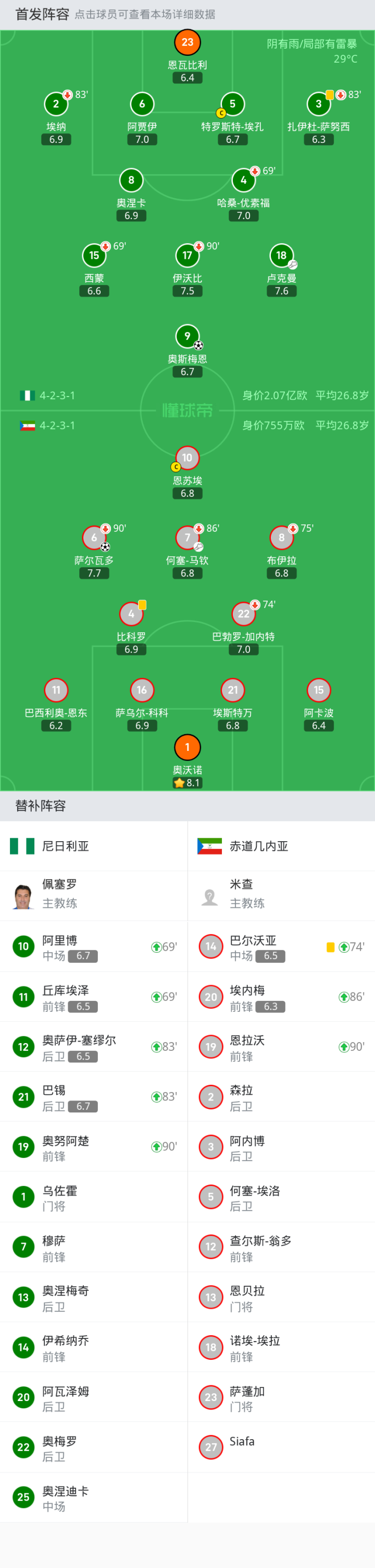 尼日利亚首发:5-特罗斯特-埃孔, 17-伊沃比, 6-阿贾伊, 2-埃纳, 15-西蒙, 9-奥斯梅恩, 18-卢克曼, 3-扎伊杜-萨努西, 8-奥涅卡, 4-哈桑-优素福, 23-恩瓦比利