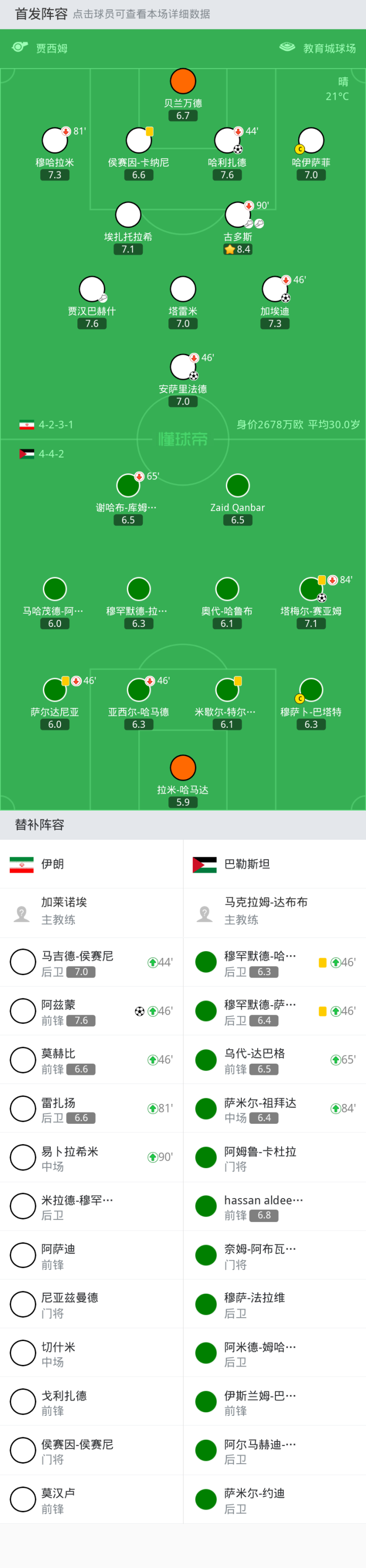 上场替补:81'23-雷扎扬, 90'8-易卜拉希米, 46'20-阿兹蒙, 44'19-马吉德-侯赛尼, 46'21-莫赫比