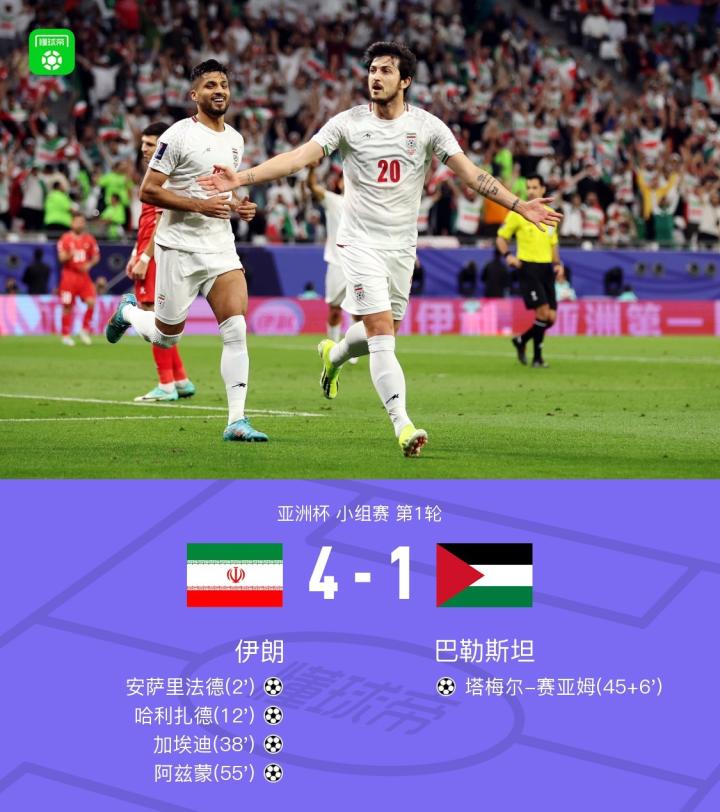 北京时间1月15日亚洲杯 小组赛 第1轮,伊朗主场对阵巴勒斯坦。上半场,古多斯助攻安萨里法德推射入网,古多斯再次助攻哈利扎德后点包抄凌空扫射破门,贾汉巴赫什斜传助攻加埃迪低射远角破门,赛亚姆头球接力入网扳回一城;下半场,阿兹蒙乱中将球打进,塔雷米抽射击中巴塔特手肘变线偏出后裁判没有判罚,萨利赫放倒阿兹蒙,裁判观看VAR后取消红牌改判黄牌。最终比分4-1。