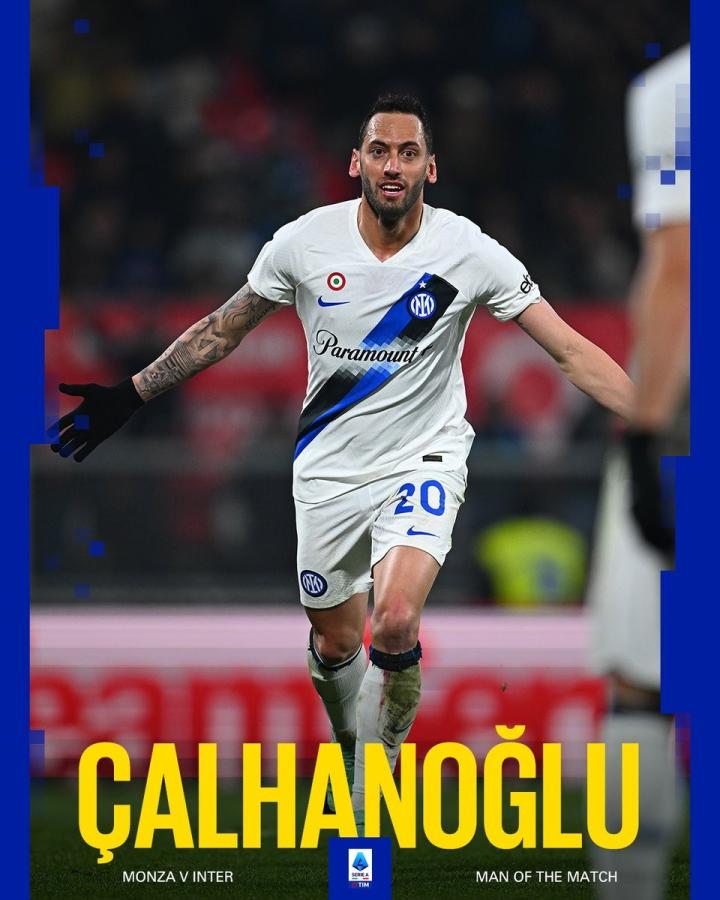 恰球王!国米官方:恰尔汗奥卢当选与蒙扎一役队内最佳