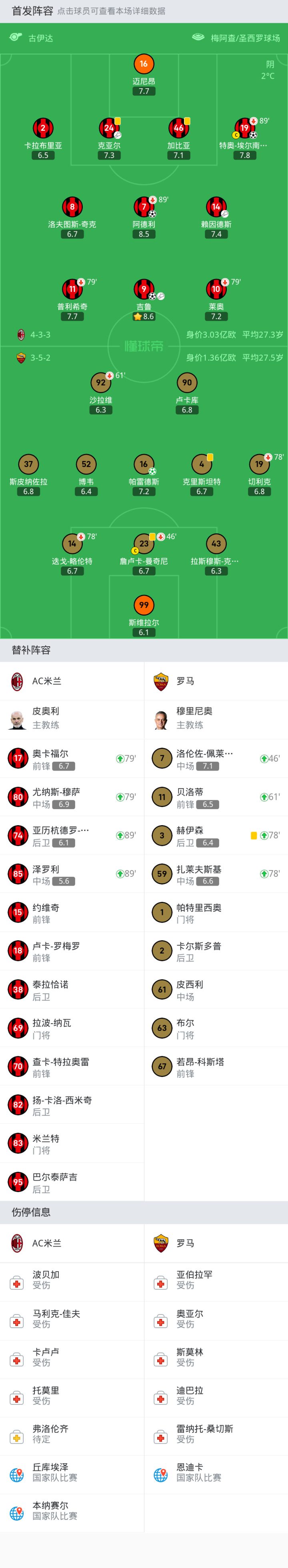 罗马首发:92-沙拉维, 90-卢卡库, 16-帕雷德斯, 37-斯皮纳佐拉, 4-克里斯坦特, 14-迭戈-略伦特, 19-切利克, 99-斯维拉尔, 23-詹卢卡-曼奇尼, 43-拉斯穆斯-克里斯滕森, 52-博韦