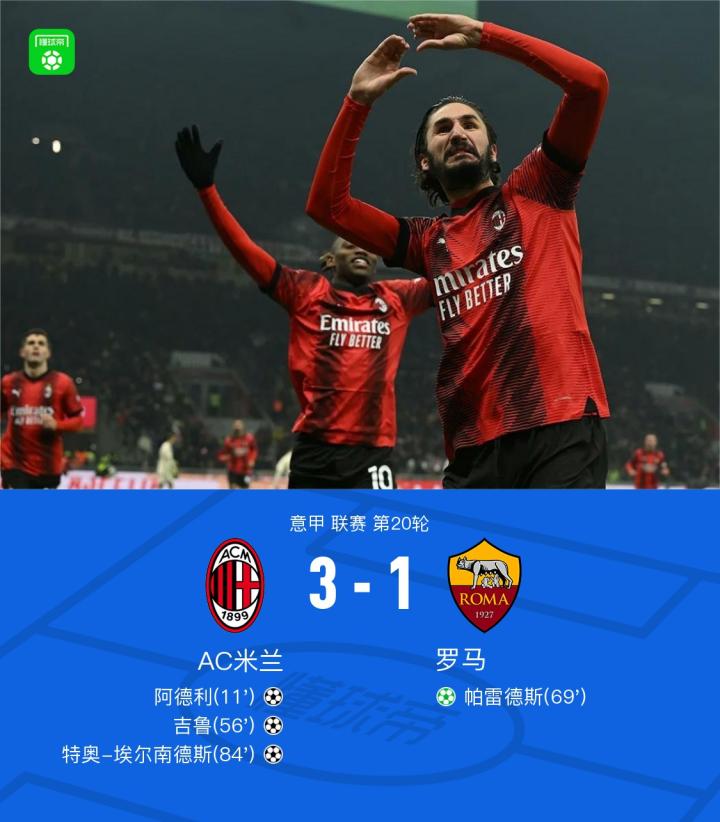 北京时间1月15日意甲联赛第20轮,AC米兰主场对阵罗马。上半场,阿德利低射收获个人米兰生涯首球。下半场,克亚尔助攻吉鲁破门。卡拉布里亚送点,帕雷德斯主罚命中扳回一城。随后,吉鲁风骚脚后跟助攻,特奥爆射将球轰入死角。全场比赛结束,米兰3-1击败罗马。