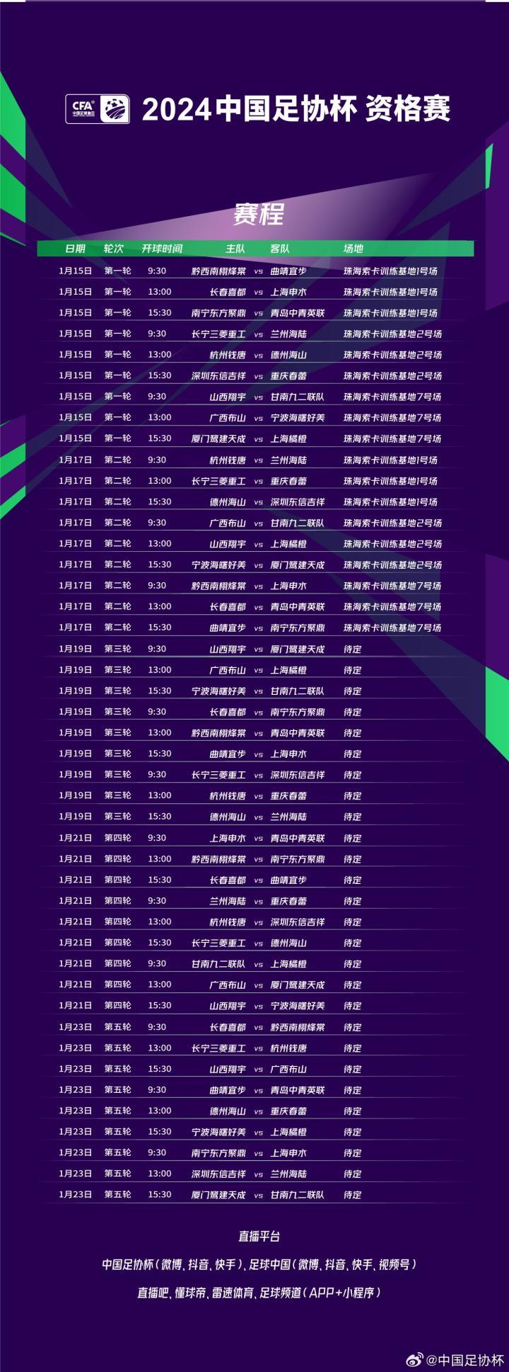 官方:2024中国足协杯资格赛将于1月15日至1月23日进行ZeroTsu_02 @懂球帝2024-01-15 10:05中国足协杯官方消息,2024年中国足协杯资格赛将于1月15日至1月23日之间在珠海索卡训练基地开赛。2024中国足协杯资格赛将在珠海索卡训练基地开赛,18支业余球队抽签分成三组,将展开五轮角逐,向足协杯正赛发起冲击。比赛将在2024年1月15日至1月23日之间进行,共5轮对决,懂球帝将全程直播本次比赛。展开更多