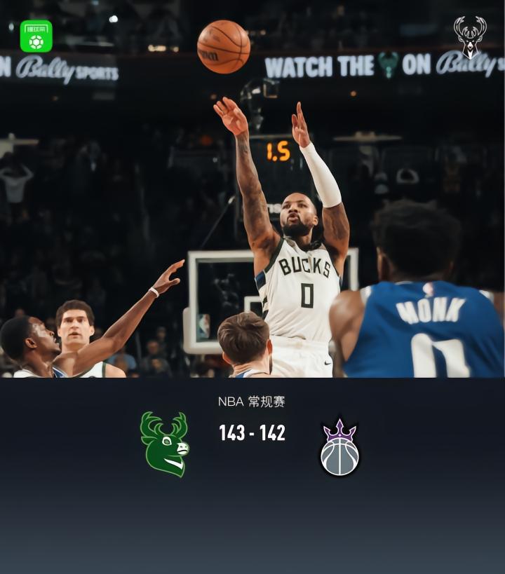 加时雄鹿利拉德拿下9分,国王福克斯拿下7分,最终雄鹿143-142战胜国王