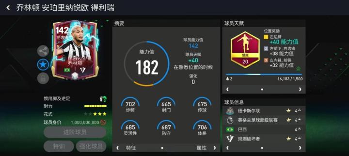 配备了猎鹰天赋的乔林顿强化了射门数据,他在门前的表现力得到了极大加强。