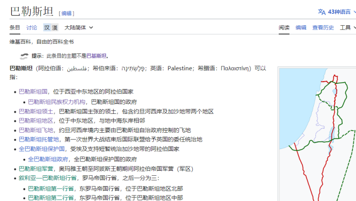 打开维基百科的中文版主页,我们不难发现,巴勒斯坦一词有不同的解释。主要包括两大类:巴勒斯坦地区和巴勒斯坦国。