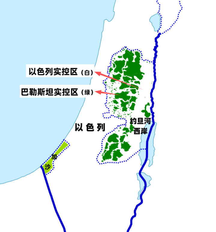 加沙地区被哈马斯实际控制,是一片完整的地区。巴勒斯坦政府的实际控制范围却不是整个约旦河西岸。根据以巴1995年签署的《奥斯陆第二号协议》,约旦河西岸被分为ABC三区。
