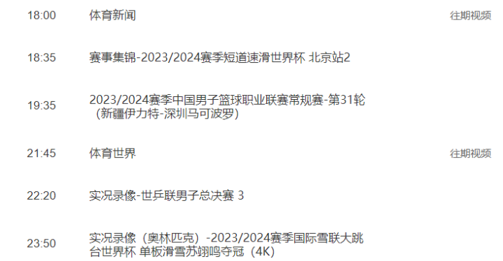1月15日,央视刚更新的一周节目单显示,央视体育频道(CCTV5)将在1月17日19:35,现场直播2023/2024赛季中国男子篮球职业联赛常规赛第31轮新疆伊力特与深圳马可波罗的比赛;央视体育赛事频道(CCTV5+)相应时间段安排的则是2023年世界蹦床锦标赛赛事集锦,以及2023年世乒联女子总决赛实况录像。