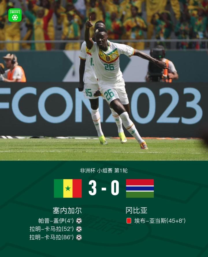 北京时间1月15日非洲杯 小组赛 第1轮,塞内加尔对阵冈比亚。此役,马内助攻帕普-盖伊低射闪击,拉明-卡马拉贴地斩+世界波连下两城上演梅开二度,埃布-亚当斯被直红罚下。最终,塞内加尔3-0完胜十人冈比亚。