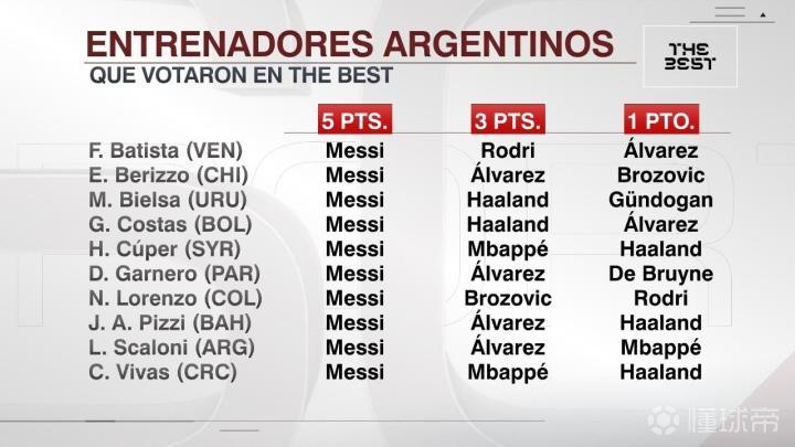 10名阿根廷籍主帅将第一票投给梅西,其中5人投了哈兰德