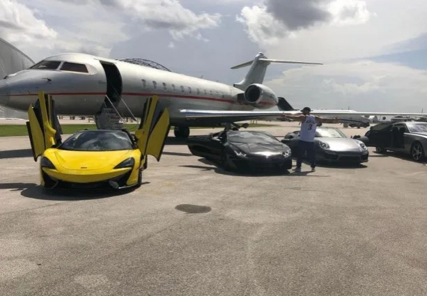 本泽马在机场跑道上与私人飞机一起展示超级跑车车队