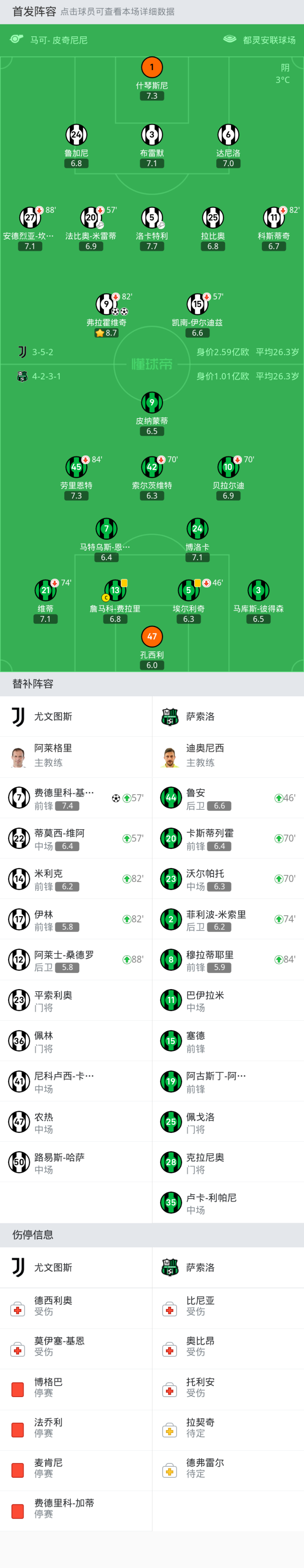 萨索洛首发:47-孔西利, 13-詹马科-费拉里, 10-贝拉尔迪, 5-埃尔利奇, 7-马特乌斯-恩里克, 9-皮纳蒙蒂, 45-劳里恩特, 24-博洛卡, 42-索尔茨维特, 3-马库斯-彼得森, 21-维蒂