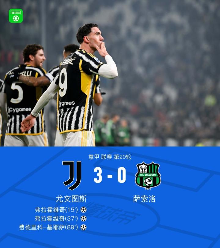 北京时间1月17日意甲 联赛 第20轮,尤文图斯主场对阵萨索洛。上半场,弗拉霍维奇旱地拔葱远射入网,布雷默甩头攻门顶偏,劳里恩特远射被什琴斯尼倒地扑出,弗拉霍维奇任意球直接破门上演梅开二度;下半场,贝拉尔迪持球推进打门被扑,小维阿在无人盯防情况下凌空抽射踢飞,小基耶萨推射击中门将变线破门。最终比分3-0。