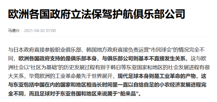 [1]马德兴. 欧洲各国政府立法保驾护航俱乐部公司. 2 April, 2021.