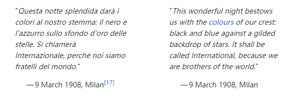 这美妙的夜晚为我们的徽章赋予色彩:蓝与黑在镀金满星的背景下交相辉映。她将被命名为国际,因为我们是世界的兄弟。—1908年3月9日,米兰(国际米兰建队宣言自译中文版)