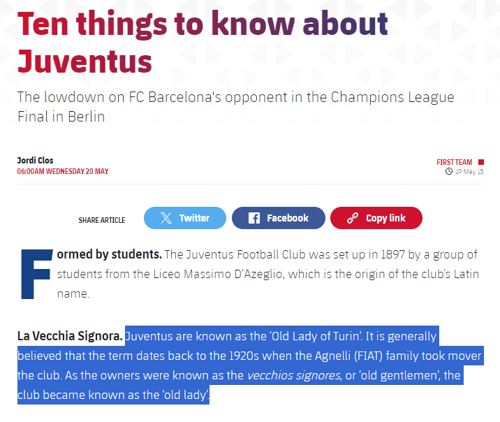 [12]Why are Juventus called 'The Old Lady'? Italian football giants' nickname explained. GOAL. 15 October 2023.
