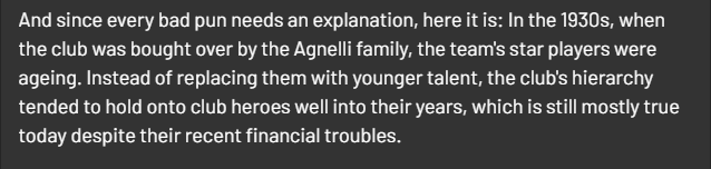 那么为什么队名叫做“青春”的尤文图斯外号却叫做“老妇人(Old Lady)”?这里我找到了两种解释: