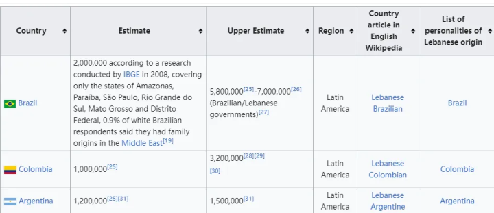 海外黎巴嫩人口最多的三个国家是巴西、哥伦比亚和阿根廷。
