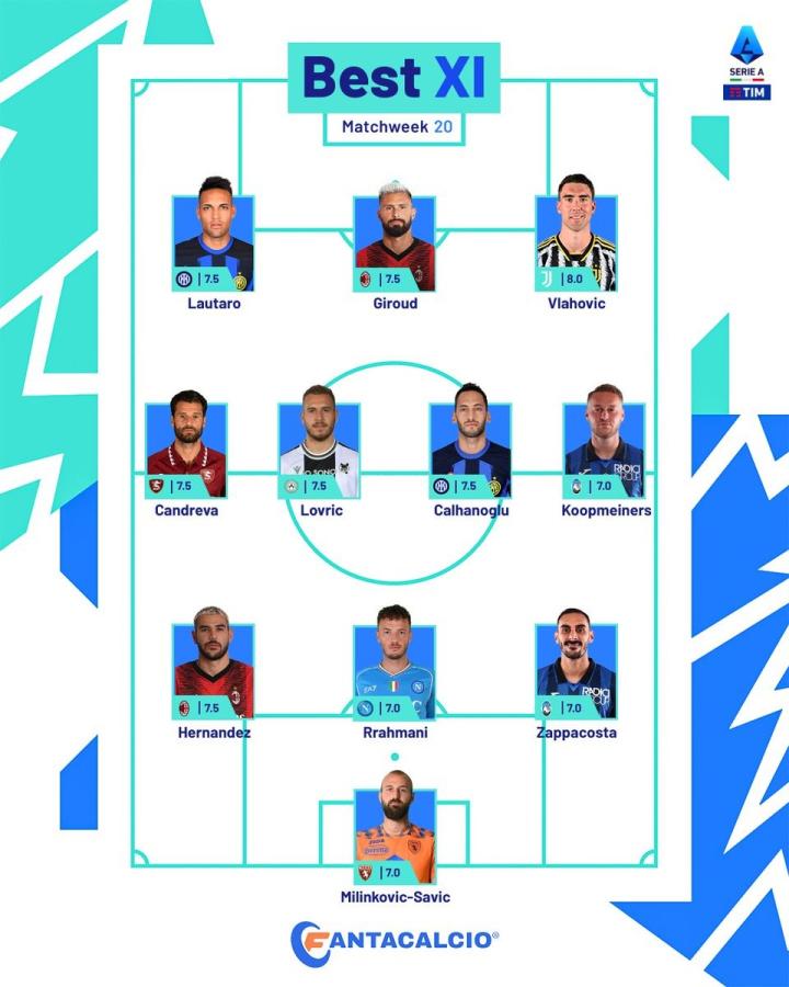 意甲官方公布了第20轮的最佳阵容,特奥、恰尔汗奥卢、弗拉霍维奇、吉鲁、劳塔罗等人入选。