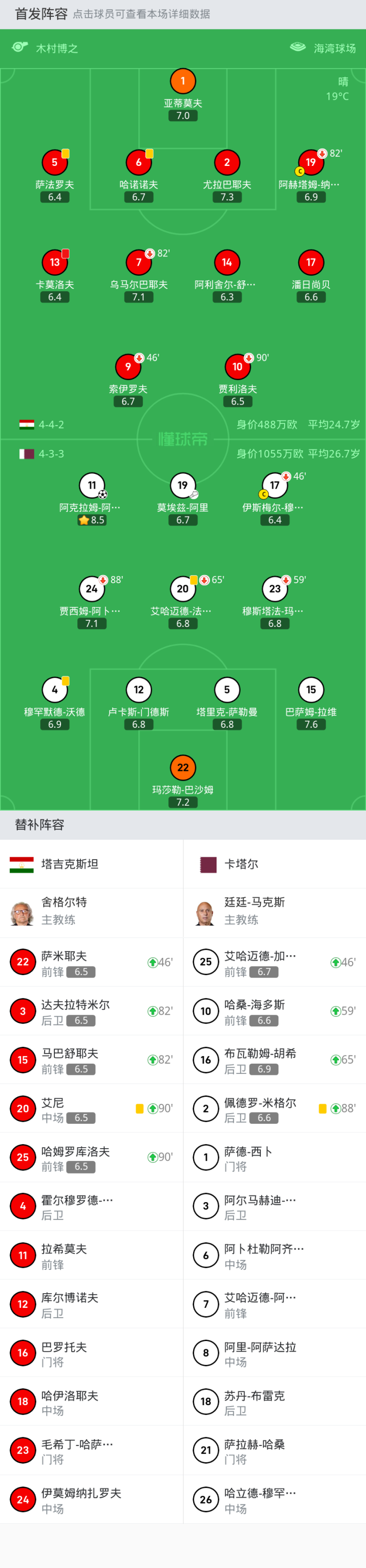 上场替补:82'3-达夫拉特米尔, 46'22-萨米耶夫, 90'+125-哈姆罗库洛夫, 90'+120-艾尼, 82'15-马巴舒耶夫
