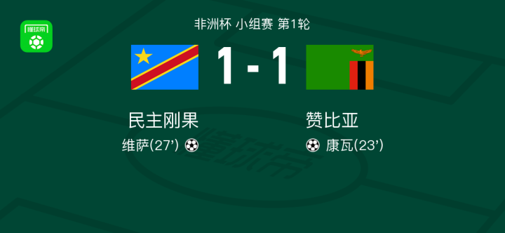 民主刚果1-1赞比亚,康瓦首开记录,维萨扳平比分