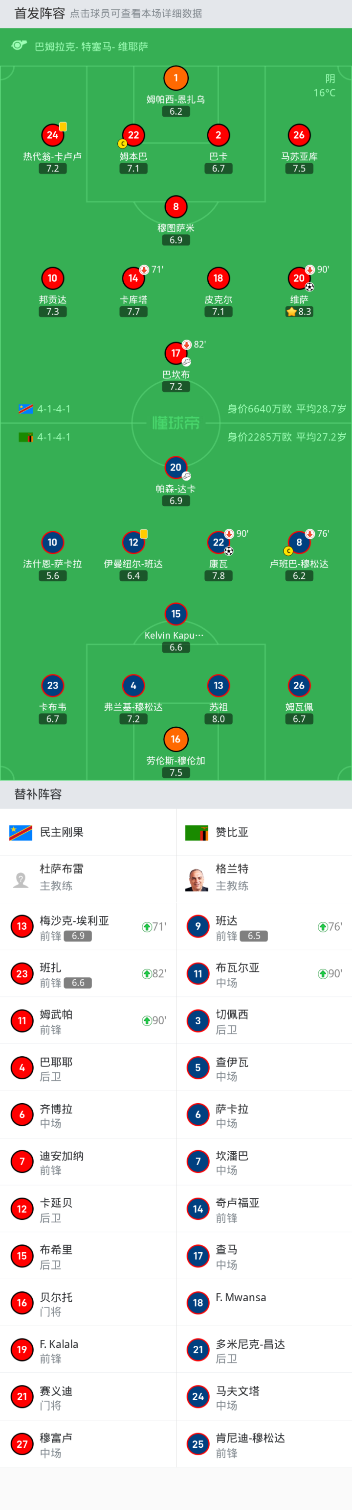 替换下场:76'8-卢班巴-穆松达, 90'+422-康瓦