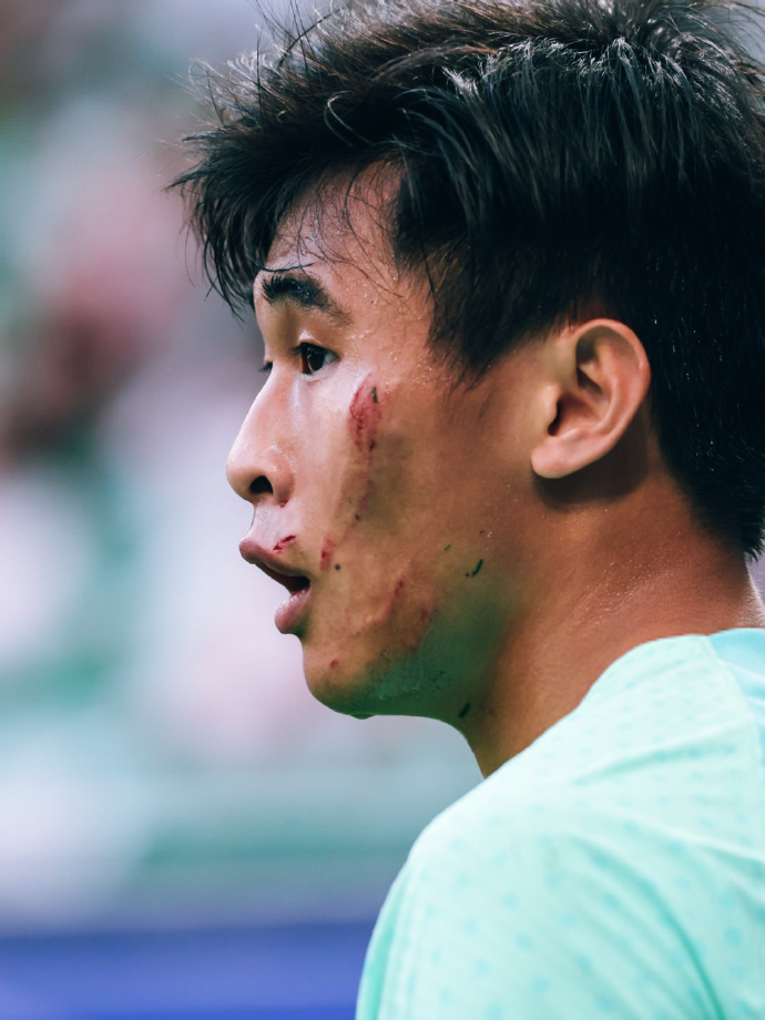 比如戴伟浚,尽管他有些过于粘球,但在进攻端的贡献无法忽视。上半场最危险的时刻,源自他的奋不顾身和脸蛋挂彩。上半场最有威胁的进攻,源自他的转身摆脱和右脚传中。