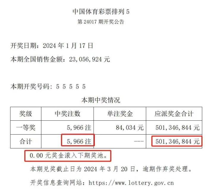 据官方统计,昨天排列五的中奖投注数共有5966注,5亿多人民币的奖池被直接清空。