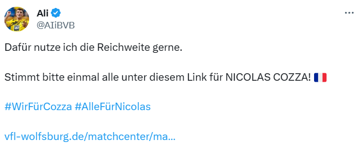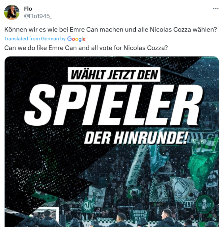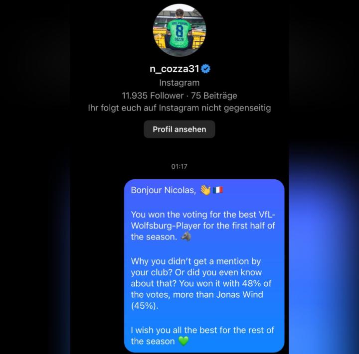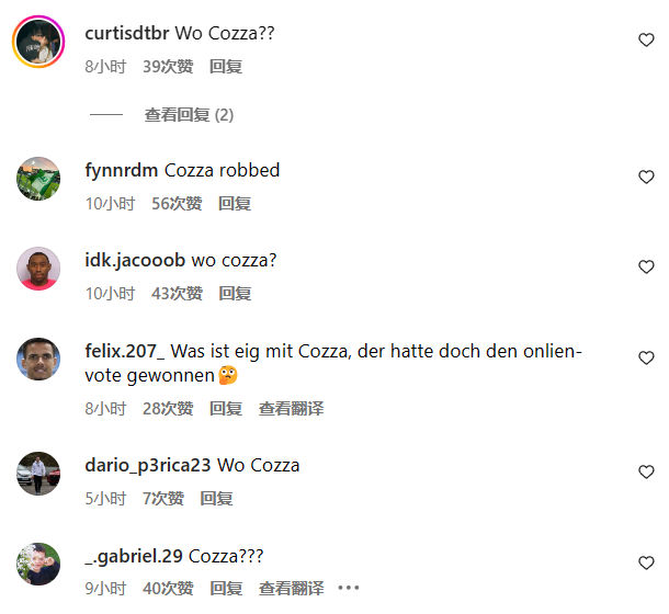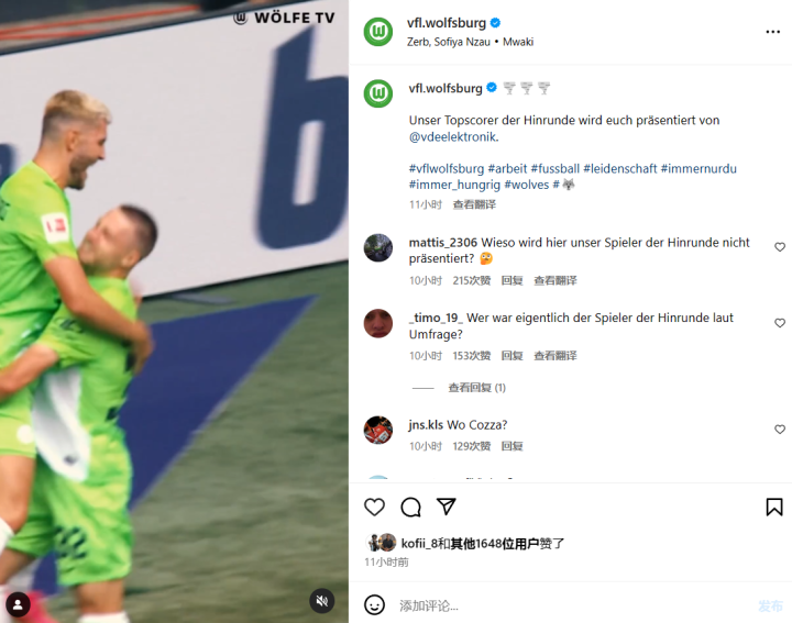 这场投票是一场牺牲了科扎的在线狂欢,并不是每个人都能像埃姆雷·詹那样放下。法国人目前还没有机会做出任何回应,俱乐部也沉默以对。不过他们在自己的官方instgram上发布了一条视频,配文“温德,上半程最佳射手”并@了赞助商VDE,这让底下的评论纷纷表示“科扎的奖被偷了”。