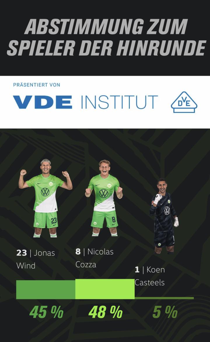 科扎上半程共出场6次,其中3场首发,场均评分只有4.25。他以极快的速度压倒温德,成为吸票机器。这不仅仅是狼堡球迷的功劳,其他俱乐部的球迷也再次发挥了作用,比如一位叫“AIiBVB”的多特蒙德球迷,他在这次“票投科”的活动中很活跃,也是发现狼堡官方可能存在做票行为的推特蓝V之一。狼堡官方在周四晚上试图向温德伸出援手,仿佛是变魔术一样(《踢球者》语),温德的票数突然上窜,甚至领先于科扎。然而上午10点投票结束时,科扎又抢回了第一的宝座,以48%的选票领先温德45%,凭3趴优势豪夺赛季上半程最佳球员。