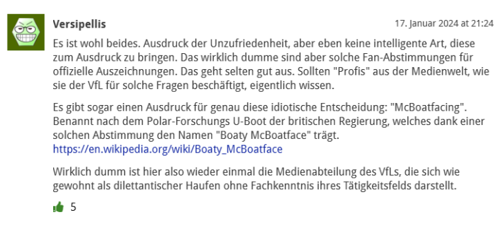 互联网上通过类似方式表达不满的做法有一个专业术语“McBoatfacing”,源于2016年英国一次为潜艇命名的在线投票,具体定义为“主办方犯了让互联网决定事情的严重错误,网民故意做出他们的选择,不是为了促进社会利益最大化,而是单纯地惹恼你”。因此有球迷质疑沃尔夫斯堡媒体部门的业余,他们表现得像一群在相关领域没有任何专业知识的闲散人员,他们应该知道这种现象可能发生。