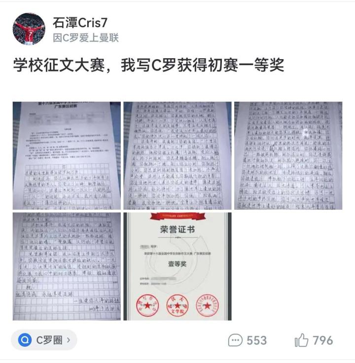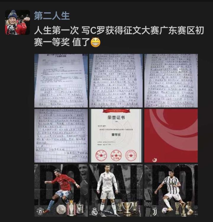 循着记忆回到儿时 懵懂的眼眶中看见在绿茵场上奔跑的少年 那是我第一次遇见你 因为你 我接触足球 我视你为偶像 自信 张狂 霸气 不可一世 无时无刻围绕着我 你教会我长风破浪会有时 教会我扶摇直上九万里 教会我永不言弃 接触足球较晚 有幸亲眼见证你重归梦剧场 那一天 梅开二度 曼彻斯特红色的海洋为你欢呼 老特拉福德的聚光灯为你闪耀 逝水比喻时光荏苒 我已从天真少年成长为追梦青年 18岁 恰同学少年 即将迎来2024高考 我辗转反侧 毅然决定来见你 高三学习重压 每当我焦虑 伤心时 是你给予我无限动力 带我面对风雨 披荆斩棘 我也有幸能在省作文大赛中以“写给C罗的一封信”获得省初赛一等奖 克里斯蒂亚诺 你教会我太多太多 希望你“千金散尽还复来”的自信与“大鹏一日同风起”的雄心能引领着我决胜六月 决胜高考 克里斯蒂亚诺·罗纳尔多 我们 深圳见!