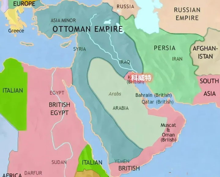 19世纪,奥斯曼帝国陷入衰落。其所在的非土耳其人地区被欧洲各个帝国主义国家蚕食。1899年,英国策动科威特省独立,将其纳入其保护国。