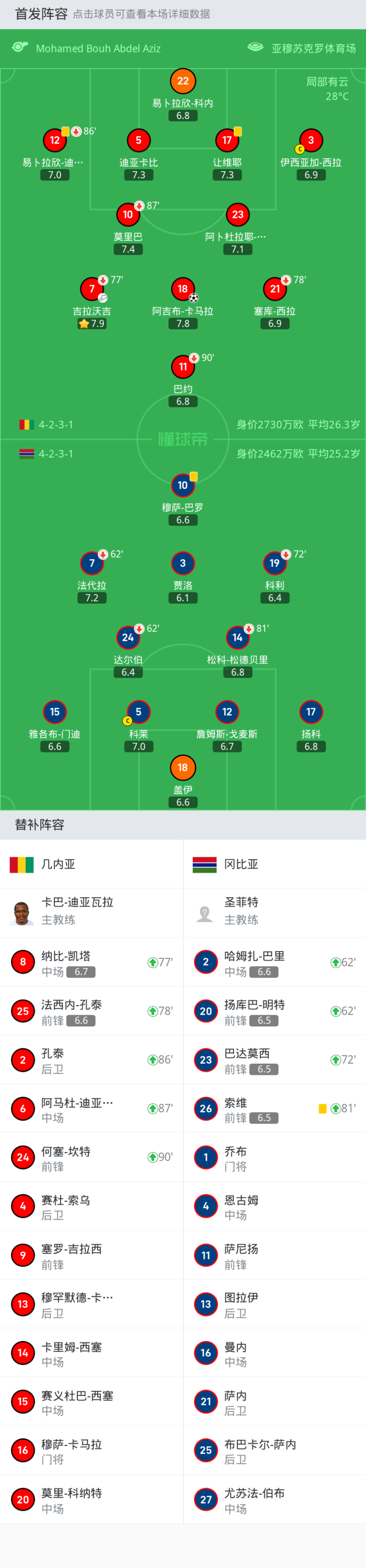 替换下场:90'+211-巴约, 78'21-塞库-西拉, 87'10-莫里巴, 77'7-吉拉沃吉, 86'12-易卜拉欣-迪亚基特