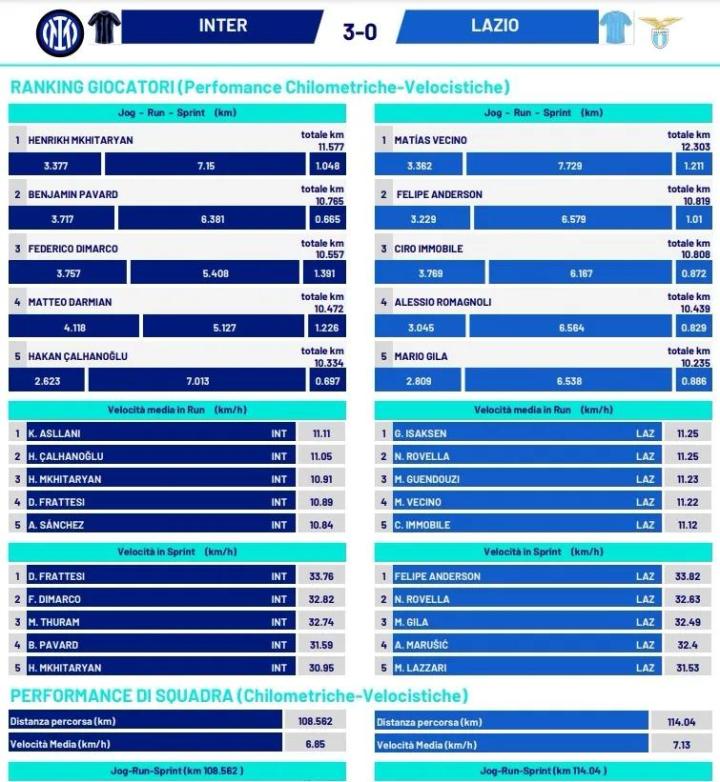 通过赛后技术统计来看,国米控球率、射门数、射正数、传球成功率、角球数等各项数据都呈现出碾压局面,但有一项数据却明显“落后”对方,那就是跑动数据,全场比赛国米跑动距离108.56公里,与拉齐奥的114.04公里相比少出5.5公里,这基本是一个球员的半场跑动量。