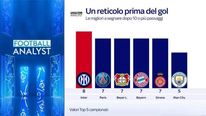 而且,国米通过这场比赛再次将球队传控为主的技战术打法展现得淋漓尽致,在高控球率下保证极高的传球成功率,通过大量传导制造杀机,寻找破门机会。根据天空体育统计,国米本赛季至今在连续传球10次及以上的情况下打进8球,力压巴黎、拜仁等豪门球队排名五大联赛第一!