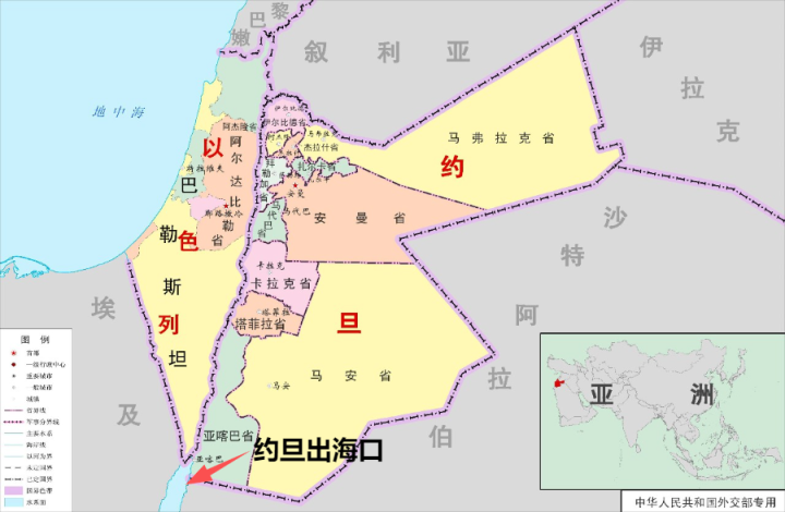 作为国家的约旦位于亚洲西部,阿拉伯半岛西北,西与巴勒斯坦、以色列为邻,北与叙利亚接壤,东北与伊拉克交界,东南和南部与沙特阿拉伯相连,西南一角濒临红海的亚喀巴湾是唯一出海口。