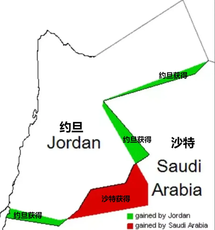 1965年,约旦和沙特达成领土互换的协议。约旦以东南部的图拜格山地区大约0.7万平方公里的领土(大部分属沙漠地区),换取了沙特的两块内陆领土和一块沿海领土(0.6万平方公里)。