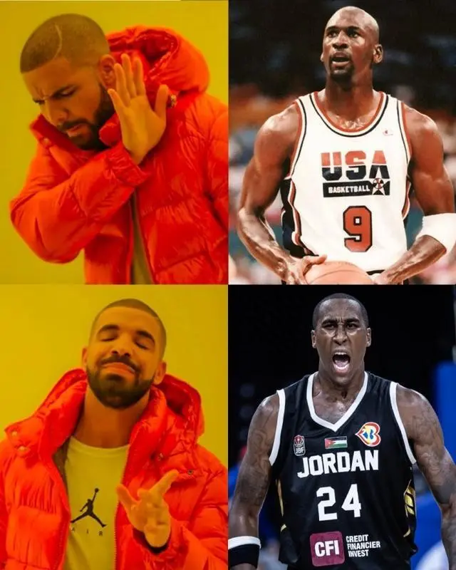2023年男篮世界杯比赛——美国vs约旦。赛前,FIBA男篮世界杯官方社媒晒图预热,并写道:“乔丹为美国队效力?No,这次乔丹在对面。”