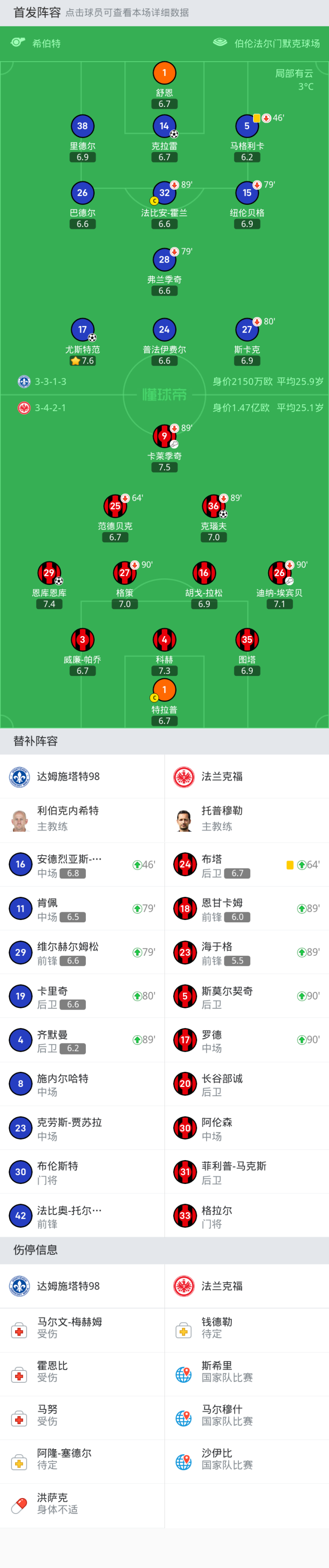 达姆施塔特98首发:32-法比安-霍兰, 1-舒恩, 26-巴德尔, 27-斯卡克, 17-尤斯特范, 24-普法伊费尔, 14-克拉雷, 28-弗兰季奇, 15-纽伦贝格, 5-马格利卡, 38-里德尔