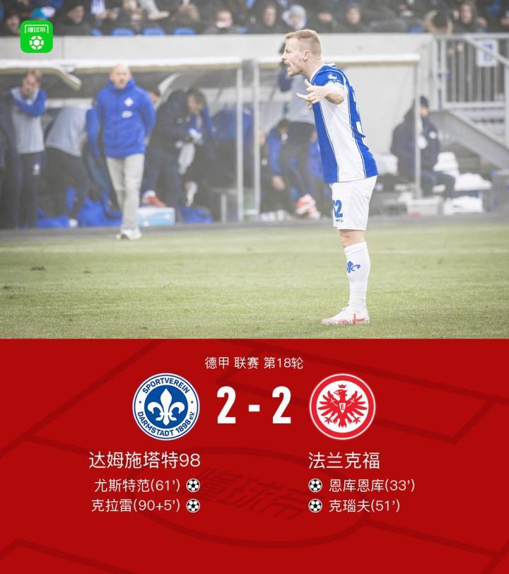 达姆施塔特98两球落后2-2法兰克福,克拉雷补时绝平救主