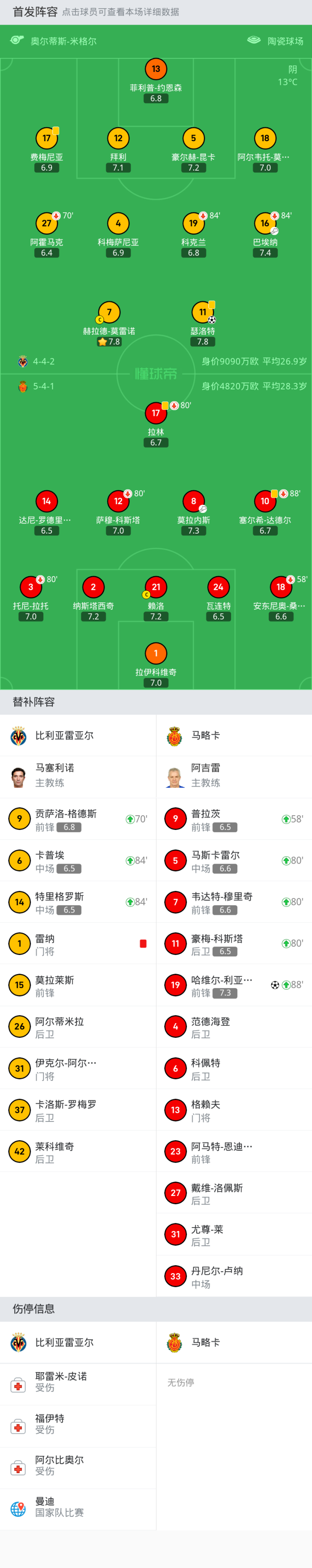 比利亚雷亚尔首发:17-费梅尼亚, 19-科克兰, 7-赫拉德-莫雷诺, 18-阿尔韦托-莫雷诺, 11-瑟洛特, 12-拜利, 4-科梅萨尼亚, 5-豪尔赫-昆卡, 16-巴埃纳, 13-菲利普-约恩森, 27-阿霍马克