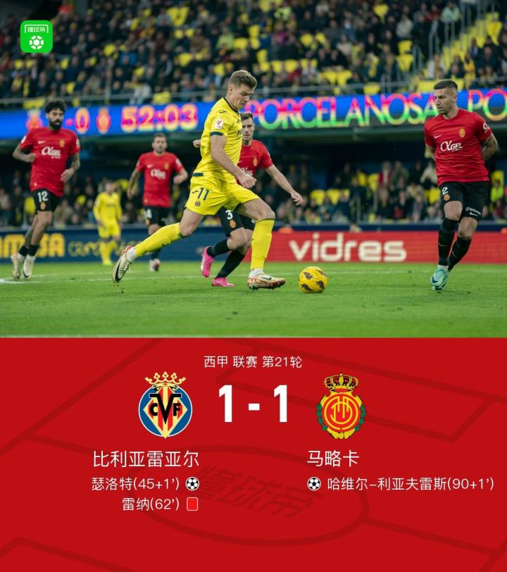 北京时间1月20日西甲 联赛 第21轮,比利亚雷亚尔主场对阵马略卡。上半场补时阶段,瑟洛特破门得分;下半场,替补席上的门将雷纳因出言不逊被主裁红牌罚下,哈维尔-利亚夫雷斯同样在补时打进一球将比分扳平。最终双方1-1握手言和,黄潜三轮不胜。