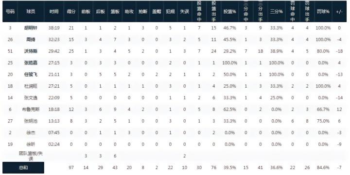 广东华南虎特雷蒙特-沃特斯25分4板5助2断,胡明轩21分2板1助3断,周琦15分7板3助;