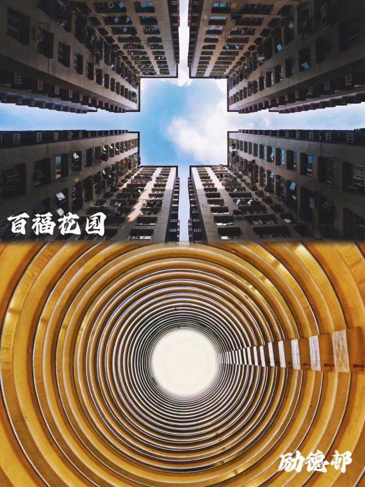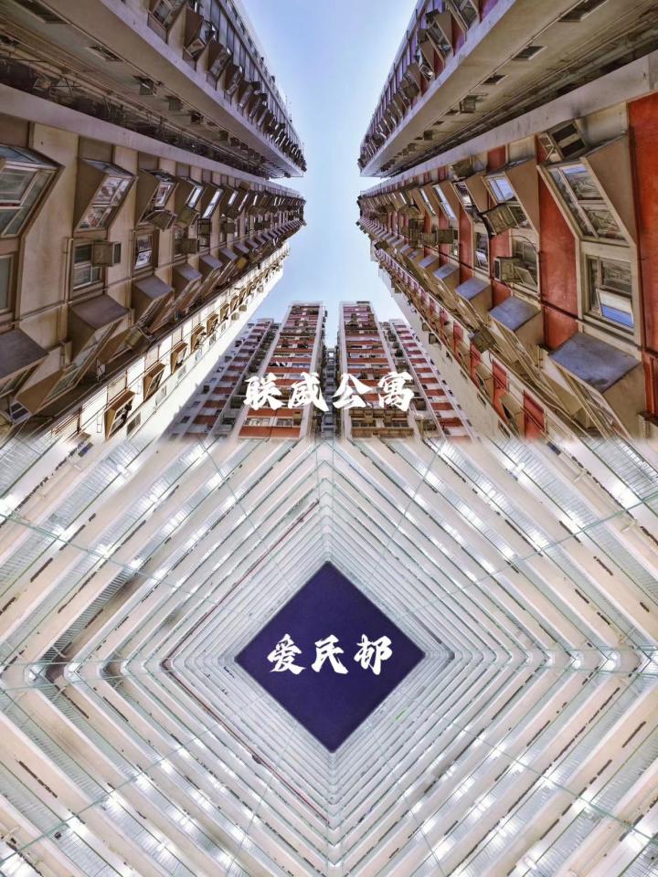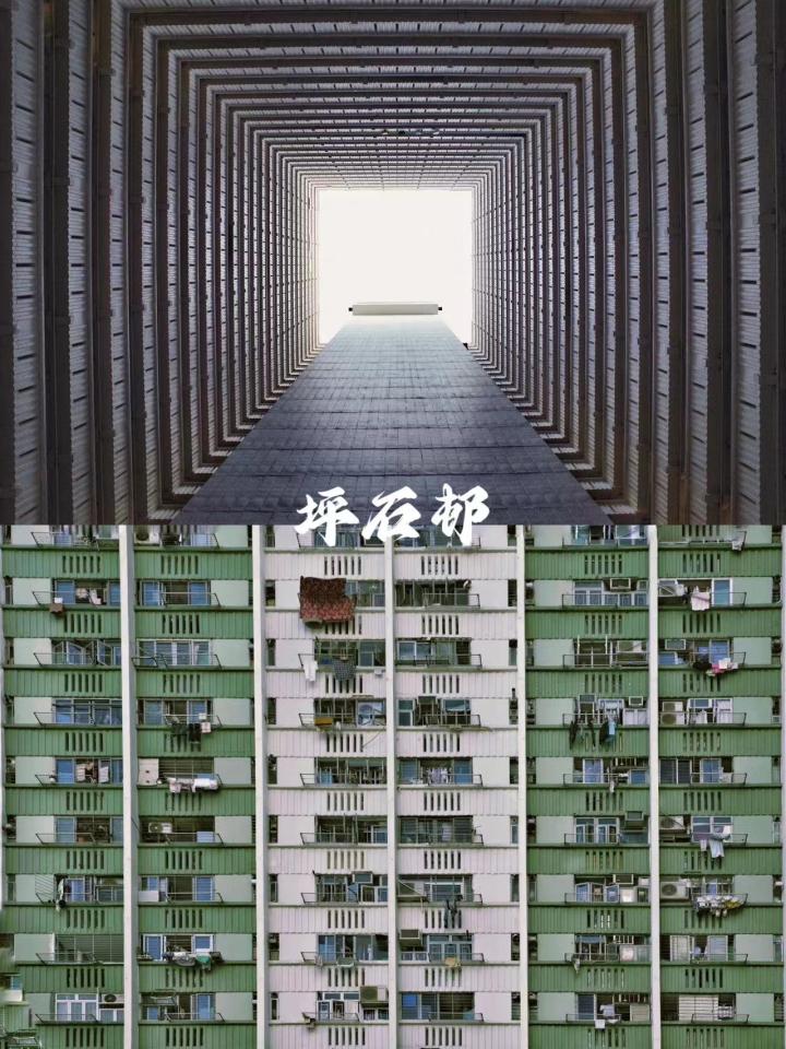 坪石邨:单元众多,外观有红、黄、绿三种,但每一个单元内部都是灰色的,从下往上看是另一种感觉,很多博主会p一架飞机在中间露出的天空上。