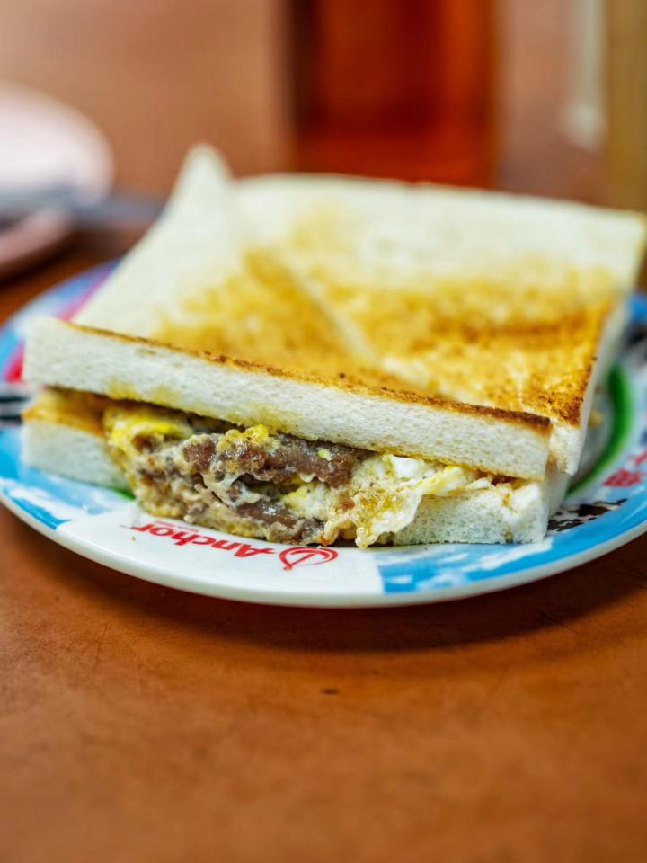 新香园坚记:全港最好吃的蛋牛烘,哪怕吃饱了,专程来买一个都值得!里面的蛋和牛肉碎是糅在一起的,有特别的香料味。不是滑蛋属于脆口香香的,三明治底部煎一下的话➕1元