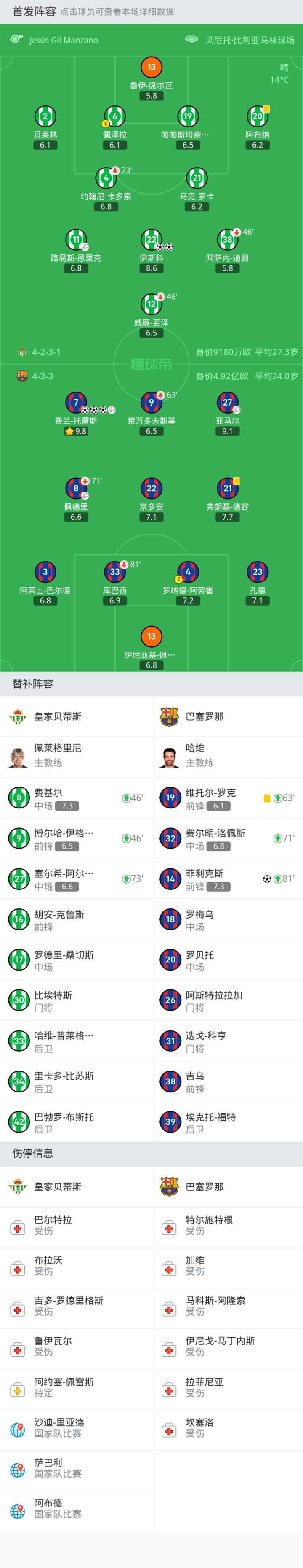 皇家贝蒂斯首发:19-帕帕斯塔索普洛斯, 12-威廉-若泽, 22-伊斯科, 6-佩泽拉, 2-贝莱林, 13-鲁伊-席尔瓦, 21-马克-罗卡, 4-约翰尼-卡多索, 11-路易斯-恩里克, 20-阿布纳, 38-阿萨内-迪奥