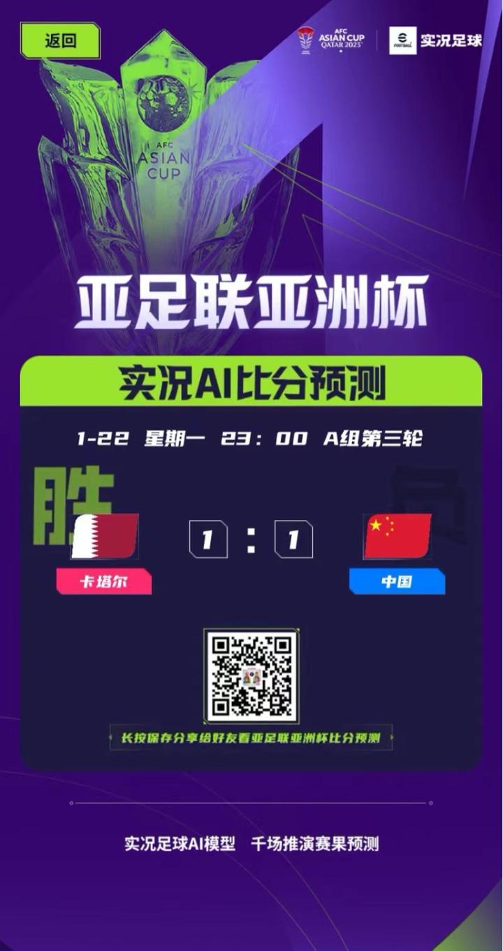 实况足球AI模型经过千场模拟,预测国足将会1-1战平卡塔尔,懂球帝编辑部也认为国足本场比赛能够取得赛事首球,1-1战平东道主。对于这个预测结果,我懂球迷们有什么看法?欢迎评论区说出你的预测!