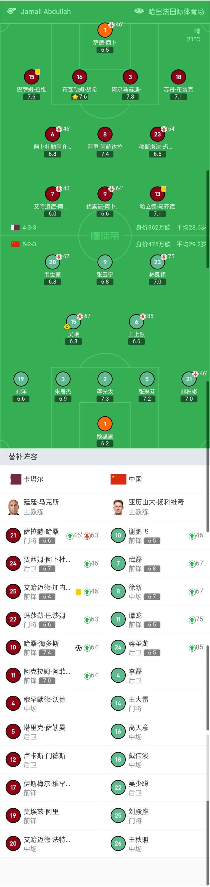 第46分钟,双方换人调整,谢鹏飞换下刘彬彬;卡塔尔这边,替补门将萨拉赫-哈桑等三人登场。
