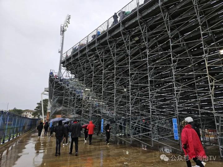 就在此时,天空开始下起大雨,而我买到的球场看台是没有顶棚的,甚至不说顶棚了,我所处的看台更像是临时搭建的,从看台后侧看,非常具有“工地”气息。不过也得感谢这些后来才搭建的看台,没有它们的话,我此行很可能因为没票而白跑一趟了。